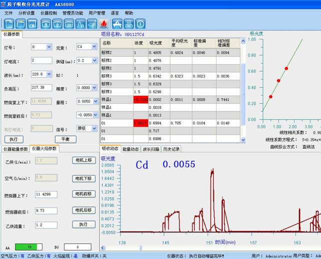 于原子吸收光譜儀 228.8 nm 處,使用空氣-乙炔貧燃火焰,以水調(diào)零,測量試液的吸光度,減去隨同試料的空白試驗溶液的吸光度,從工作曲線上查出相應(yīng)的鎘濃度。