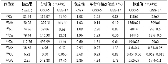 在優(yōu)化的儀器工作參數(shù)下,建立標準溶液工作曲線(線性相關(guān)系數(shù)達0.999以上),再分別取待測溶液上清液上機測試。其中:取兩個平行樣測試結(jié)果的平均值為分析值;對樣品空白溶液平行測定11次,計算11次測試結(jié)果的SD,以3×SD/k(k為標準溶液工作曲線的斜率)對應(yīng)的值為方法檢出限。取一份GSS-17樣品溶液進行穩(wěn)定性考查,即間隔2min采集一個數(shù)據(jù),連續(xù)采集7組數(shù)據(jù),計算7組數(shù)據(jù)的RSD,作為穩(wěn)定性指標。所得實驗數(shù)據(jù)見表4。