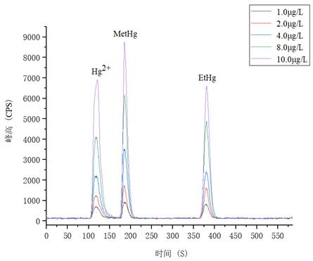 1.0μg/L、2.0.μg/L、4.0μg/L、8.0μg/L、10.0μg/L 汞形態(tài)混合標(biāo)準(zhǔn)溶液分離色圖譜如圖3所示,其中無機汞(Hg2+)、甲基汞(MetHg)、乙基汞(EtHg)相對保留時間分別為118s、185s、379s,從譜圖疊加圖上可以看出,三種汞形態(tài)出峰時間穩(wěn)定,且分離度較好。