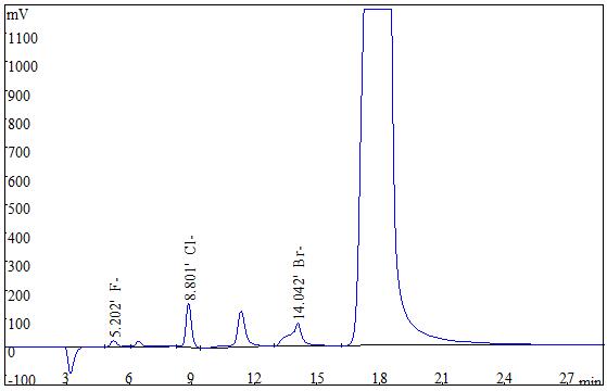 準(zhǔn)確稱取0.2g(精確至0.0001g)試樣,采用氧彈燃燒后冷卻定容,經(jīng)0.22μm的水系濾膜過濾后上機得到測試譜圖如下圖2、圖3所示。