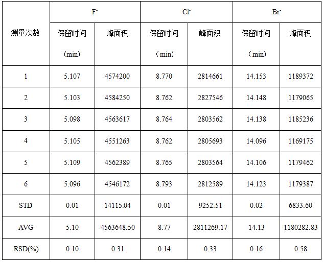 取2.0μg/mL F-、Cl-、Br-混合標(biāo)準(zhǔn)標(biāo)準(zhǔn)溶液重復(fù)進(jìn)樣6次,考察保留時間和峰面積的重復(fù)性,詳見圖4;其中保留時間(tR)相對偏差在0.10%-0.16%之間,峰面積(S)的相對標(biāo)準(zhǔn)偏差在0.38%~0.53%之間,重復(fù)性結(jié)果詳見表1。