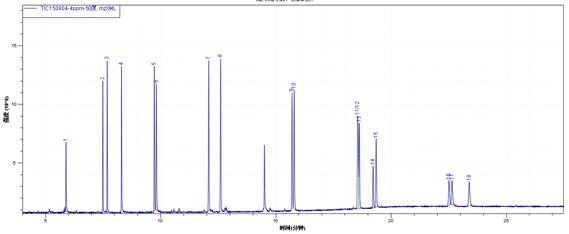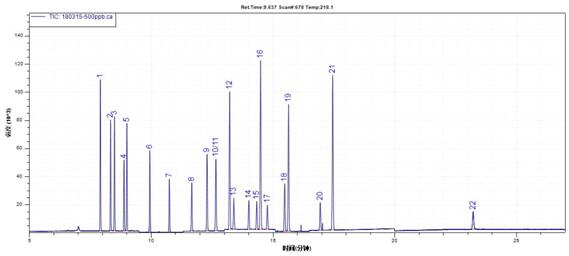 1. α-六六六;2. β-六六六;3. γ-六六六;4. 蒽-D10(內標);5. δ-六六六;6. 七氯;7. 艾氏劑;8. 環(huán)氧七氯B;9. γ-氯丹;10. 硫丹I;11. α-氯丹;12. 4,4'-DDE;13. 狄氏劑; 14. 異狄氏劑;15. 硫丹 II;16. 4,4'- DDD; 17. 異狄氏醛;18. 硫丹硫酸酯;19. 4,4'-DDT;20. 異狄氏酮; 21. 甲氧DDT;22. 苝-D12(替代物);