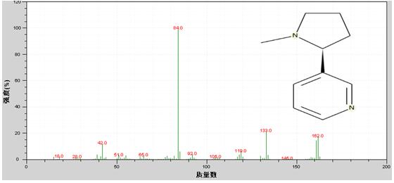 尼古?。?span>Nicotine),俗名煙堿,是一種存在于茄科植物(茄屬)中的生物堿,也是煙草的重要成分之一。尼古丁會使人上癮或產(chǎn)生依賴性,重復使用可導致心臟速度增加、血壓升高和食欲降低,攝入大劑量尼古丁會引起惡心甚至嘔吐,嚴重禍及死亡。氣相色譜質譜聯(lián)用儀(GCMS),采用氣相色譜分離和電子轟擊電離源(EI)配合全掃描模式完成定性分析,GCMS-SIM模式實現(xiàn)定量分析,可應用于煙草中尼古丁的檢測。