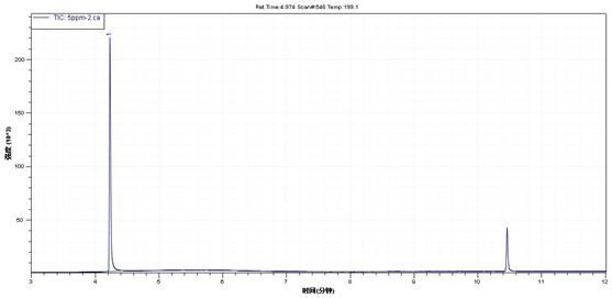 目標物在5ppm-100ppm線性良好。取低含量尼古丁加標,樣品經(jīng)過乙酸乙酯超聲萃取。50ppm加標水平下譜圖如下,得到了比較滿意的效果。