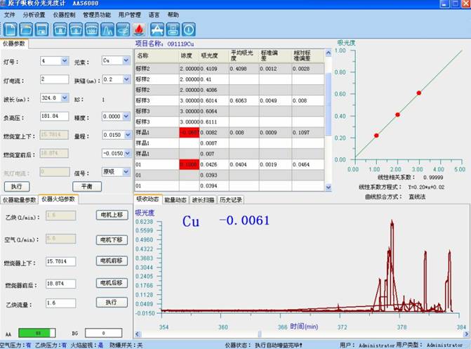 樣品測(cè)試:于原子吸收光譜儀波長(zhǎng)324.8nm處,使用空氣-乙炔火焰,以水調(diào)零,測(cè)量試液的吸光度,減去隨同試料的空白試驗(yàn)溶液的吸光度,從工作曲線上查出相應(yīng)的銅濃度。