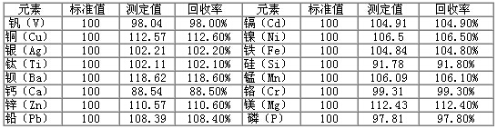 采用本方法測(cè)試潤(rùn)滑油金屬含量光譜分析標(biāo)準(zhǔn)物質(zhì)GBW(E)130129、GBW(E)130132,對(duì)比實(shí)際測(cè)定值與標(biāo)準(zhǔn)值,得出實(shí)際測(cè)試的回收率,得到準(zhǔn)確度數(shù)據(jù),結(jié)果見下表
