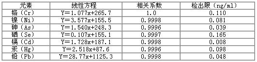 表2.各元素標(biāo)準(zhǔn)曲線線性方程及檢出限