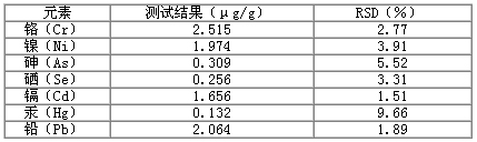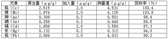 Hg標(biāo)液?jiǎn)为?dú)為一組。Cr 、Ni 、As 、Se 、Cd 和Pb 標(biāo)液用各元素10μg/mL的標(biāo)液稀釋至所需濃度。配制Hg標(biāo)液時(shí)加入0.1mL 20 μg/mL金標(biāo)準(zhǔn)溶液。分析結(jié)果(表2)顯示,這7種元素的線性方程的相關(guān)系數(shù)為0.9996~1.000 ,檢出限為0.008~0.165ng/mL。