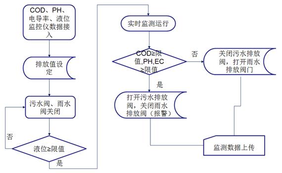 監(jiān)測系統(tǒng)控制采樣單元將水樣導(dǎo)入監(jiān)測室,并啟動監(jiān)測水質(zhì)的COD、pH、電導(dǎo)率等常規(guī)參數(shù)。達(dá)標(biāo)雨水通過電控閥門排入市政雨水管網(wǎng),一旦超標(biāo)電控閥門關(guān)閉,禁止雨水排入市政雨水管網(wǎng),并通過水泵將超標(biāo)雨水泵入企業(yè)污水處理系統(tǒng)處理,達(dá)標(biāo)后排放至市政污水管網(wǎng)。同時所有監(jiān)測數(shù)據(jù)經(jīng)由數(shù)據(jù)采集單元將數(shù)據(jù)統(tǒng)計后,由傳輸設(shè)備傳輸至企業(yè)監(jiān)測中心或環(huán)保局,由此完成對雨水排放自動、實時、連續(xù)監(jiān)控。
