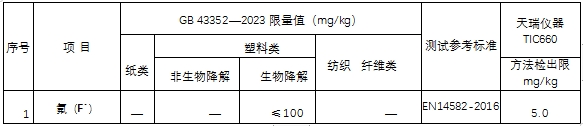 參照EN14582-2016標(biāo)準(zhǔn),樣品用氧彈燃燒儀燃燒后冷取、定容,經(jīng)0.22μm水系濾膜過濾后,用天瑞儀器離子色譜儀TIC660進(jìn)行測(cè)試,以保留時(shí)間和色譜峰進(jìn)行定性,外標(biāo)法進(jìn)行定量;方法檢出限5.0mg/kg,加標(biāo)回收率為106%。通過本實(shí)驗(yàn)結(jié)果表明,該方法檢出限低、靈敏度高、穩(wěn)定性好、方法回收率高,且前處理方法簡單,可滿足快遞外包裝袋中氟離子的測(cè)試需求。