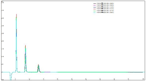 取2.0μg/mL F-、Cl-、Br-混合標準標準溶液重復進樣6次,考察保留時間和峰面積的重復性,詳見圖4;其中保留時間(tR)相對偏差在0.10%-0.16%之間,峰面積(S)的相對標準偏差在0.38%~0.53%之間,重復性結(jié)果詳見表1。