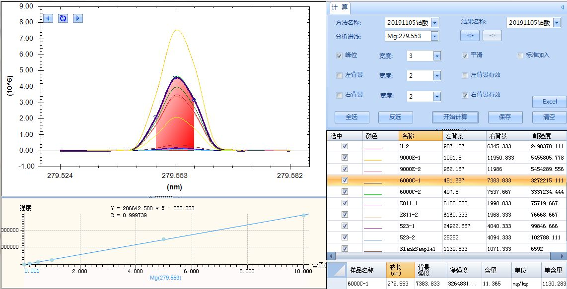 入射功率1150W,頻率27.12MHz ,觀測方式為軸向觀測,等離子氣流量:14L/min,輔助氣流量:0.8L/min,霧化氣流量:0.7L/min,蠕動泵轉(zhuǎn)速:2.0mL/min,積分時間15s,重復(fù)3次,取平均值。