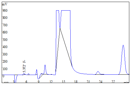 將大米、茶葉試樣分別粉粹后過篩,各稱取0.25g(精確至0.0001g),于氧彈燃燒儀進(jìn)行燃燒,冷卻后定容,經(jīng)0.22μm的水系濾膜過濾后上機(jī)得到樣品譜圖,如下圖3、圖4所示;食用油樣品直接稱重后進(jìn)行氧彈燃燒,測試得到的譜圖如圖5所示;生活飲用水直接上機(jī)后得到樣品譜圖詳見圖6。其中大米、茶葉、食用油中氟離子的測定結(jié)果均低于方法檢出限,同時對4種試樣進(jìn)行了加標(biāo)處理,加標(biāo)回收率在95.6%~102.3%之間。測試數(shù)據(jù)詳見表2。
